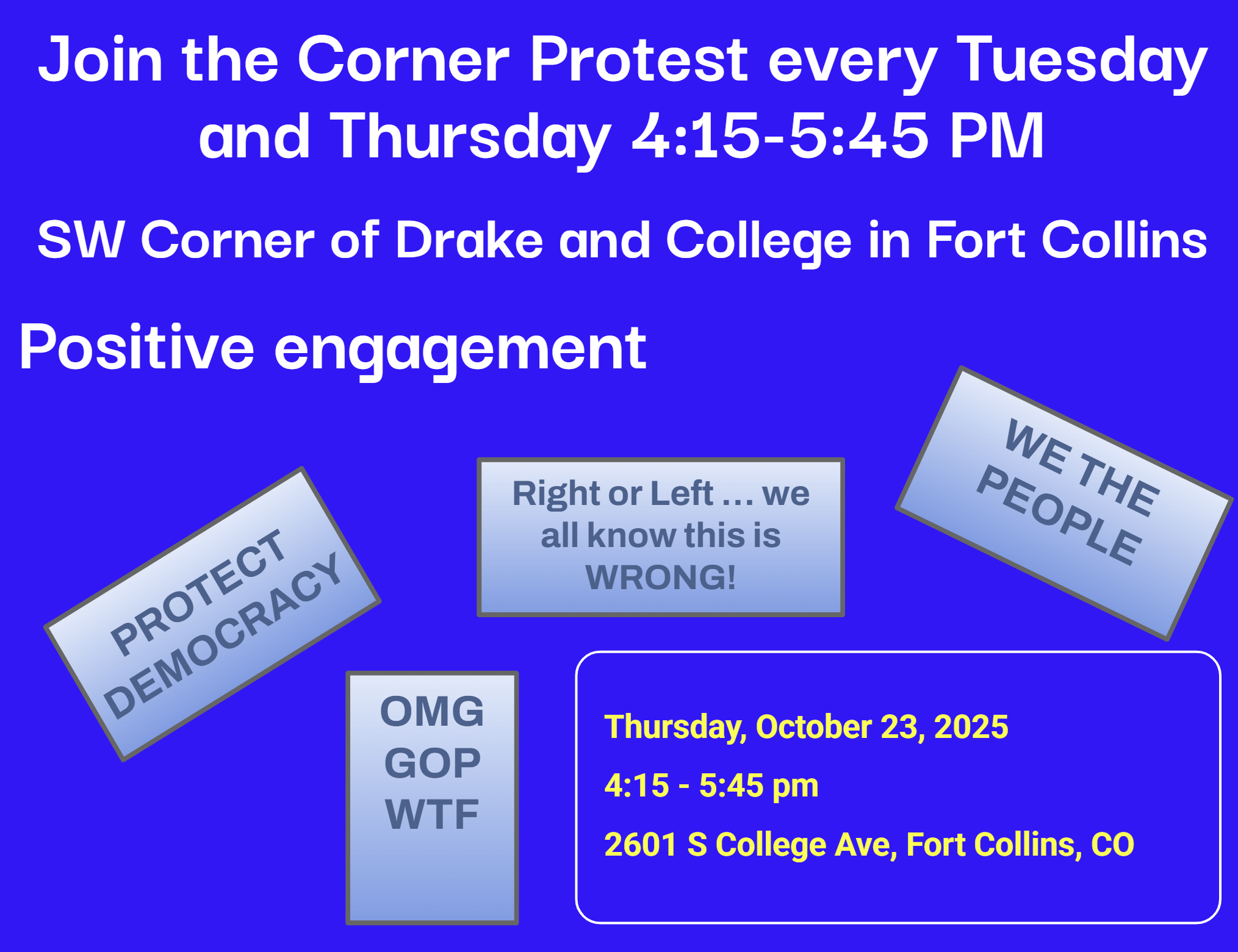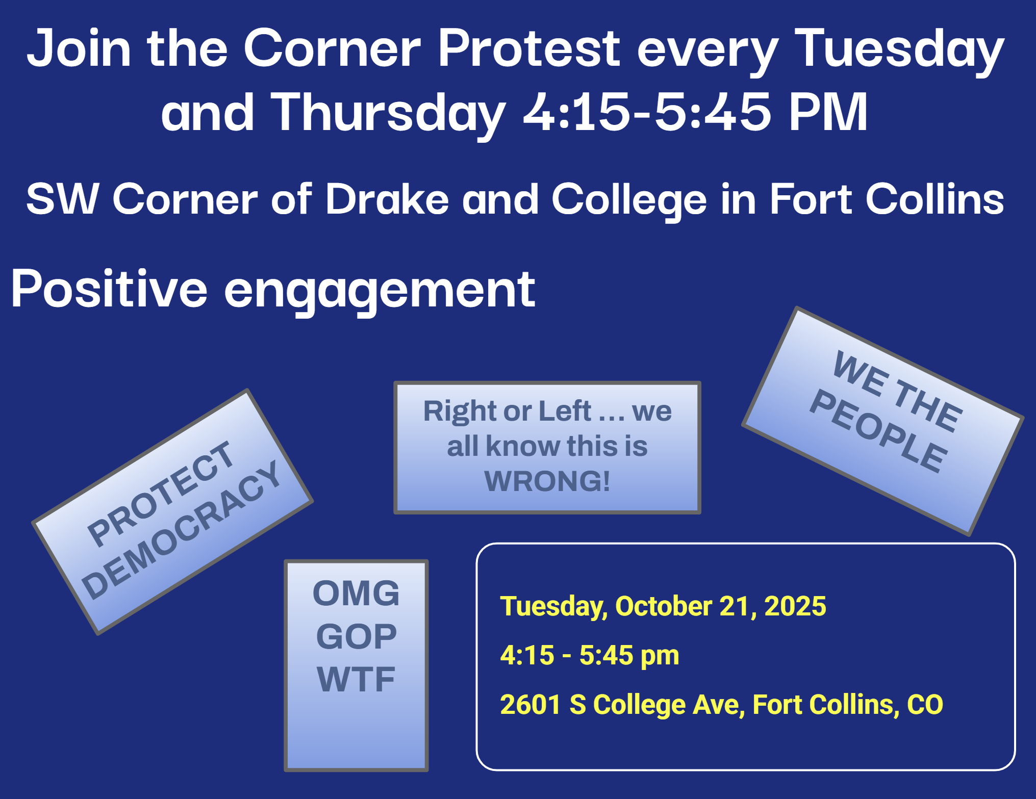 Join us for the Corner Protest every Tuesday and Thursday at the SW Corner of Drake and College in Fort Collins. We aim to engage positively and express collective concerns like protecting democracy.