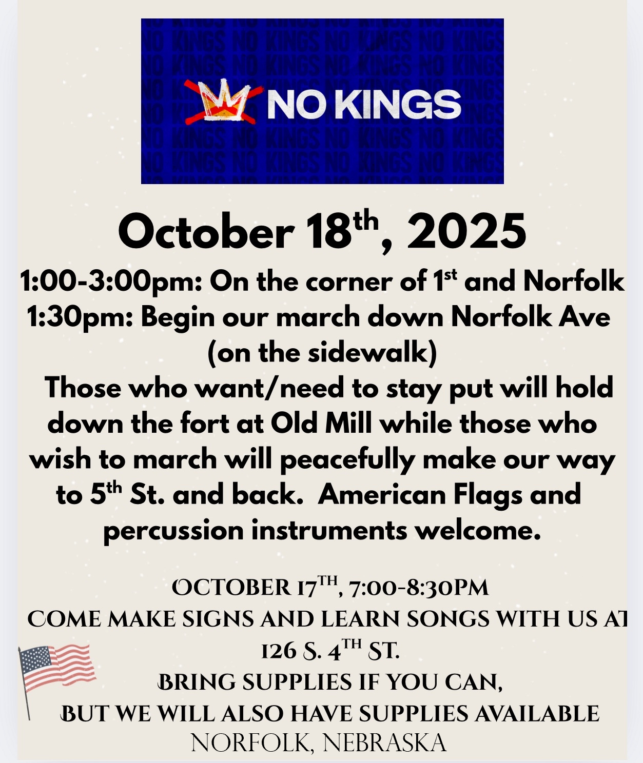 Join us on October 18th, 2025, for the NO KINGS event. Engage in a peaceful march starting from the corner of 1st and Norfolk. For those preferring to stay put, hold the fort at Old Mill. Join us on October 17th to make signs and learn songs at 126 S. 4th St. American Flags and percussion instruments are welcome.