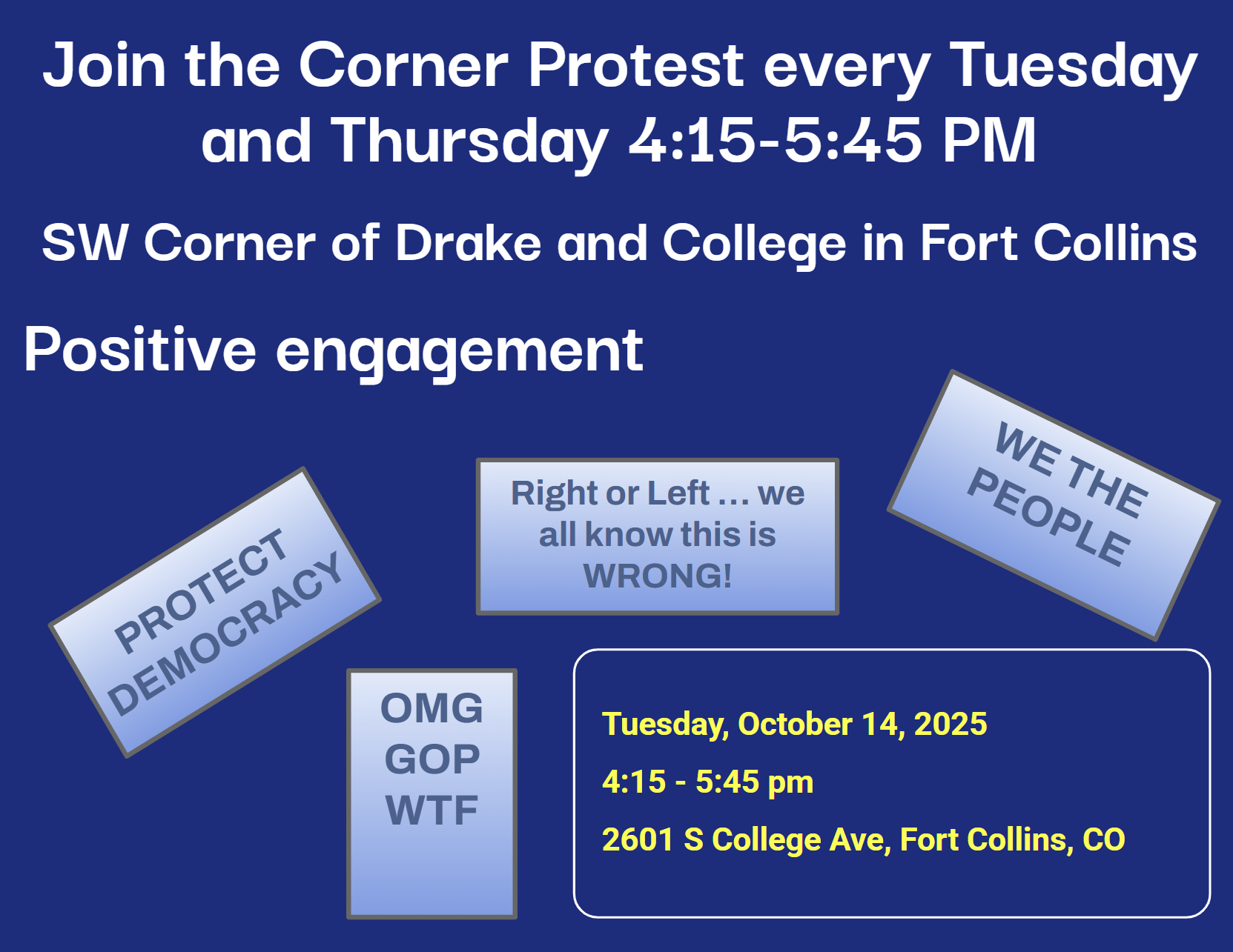 We invite you to join us for the Corner Protest at the SW Corner of Drake and College in Fort Collins. Engage positively to protect democracy and express your thoughts.