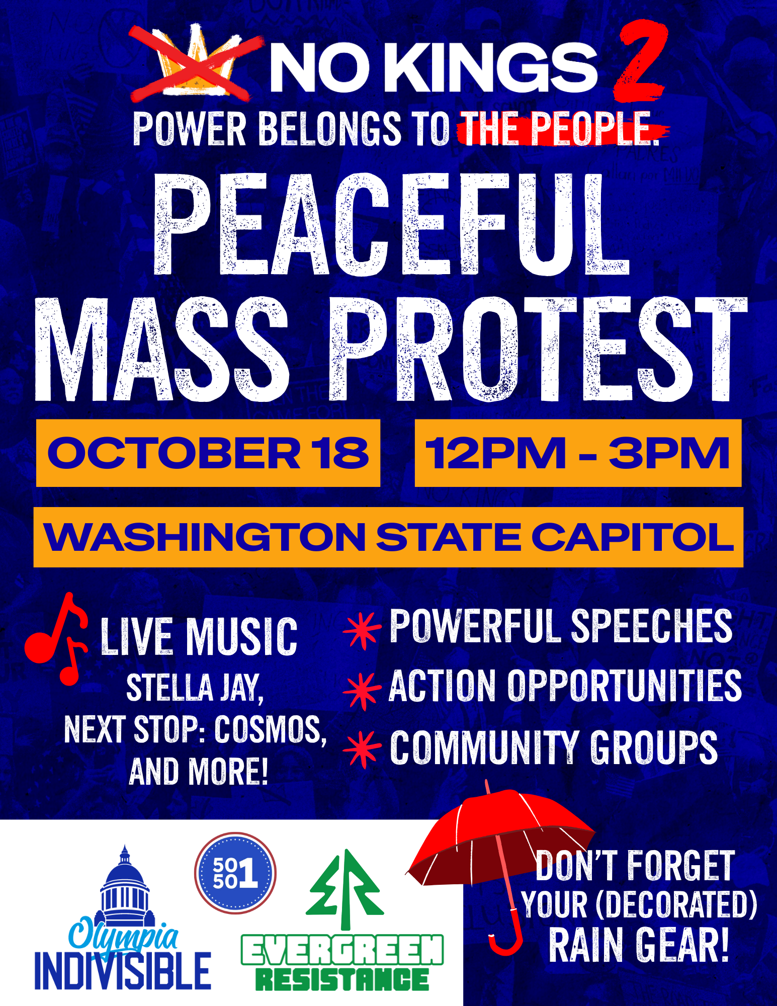 Join us for a peaceful mass protest at the Washington State Capitol. Experience live music from Stella Jay and Next Stop: Cosmos, hear powerful speeches, and participate in action opportunities with community groups. Bring your decorated rain gear!