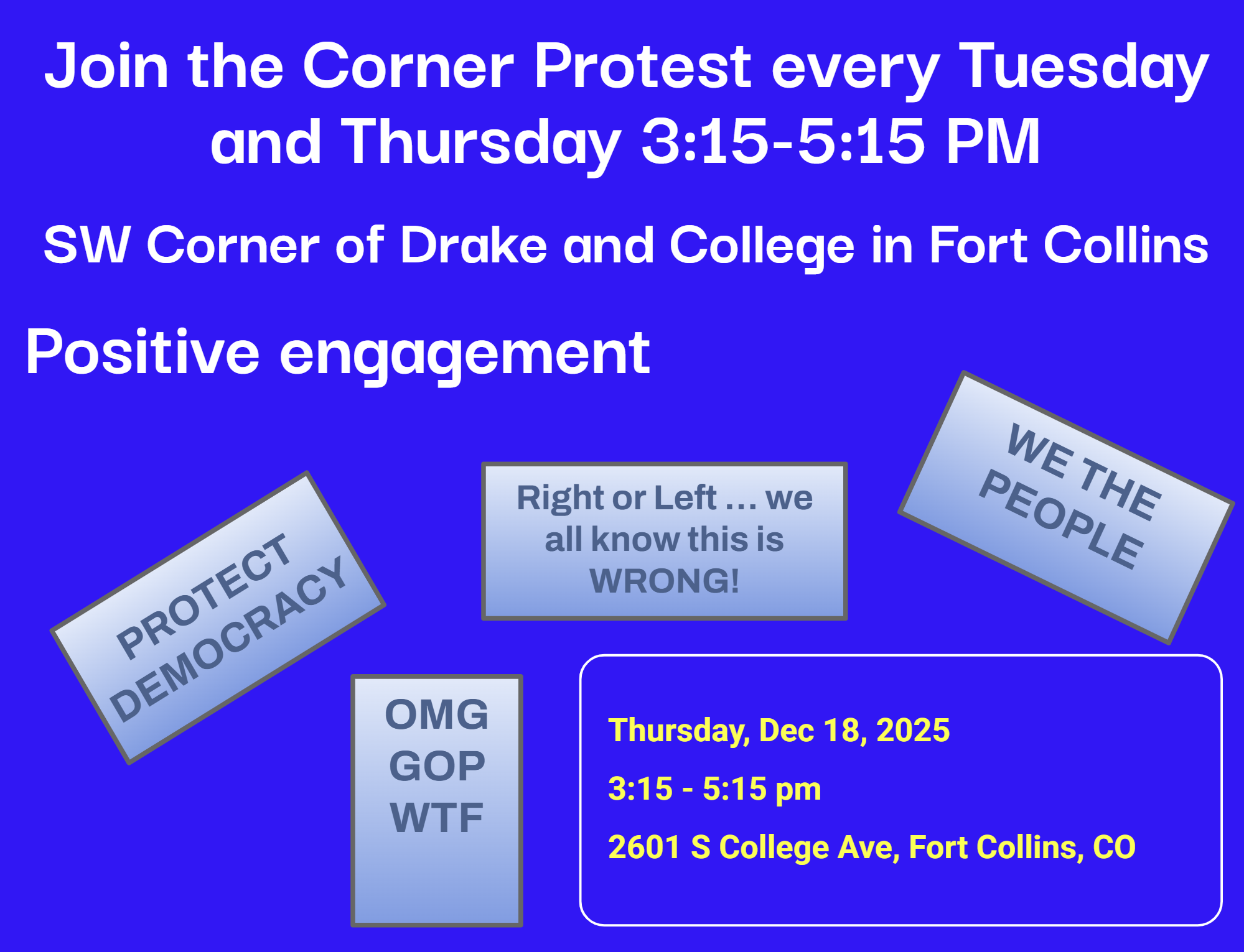 Join us for a recurring protest at the southwest corner of Drake and College in Fort Collins. We aim for positive engagement to protect democracy, acknowledging wrongs across political divides.