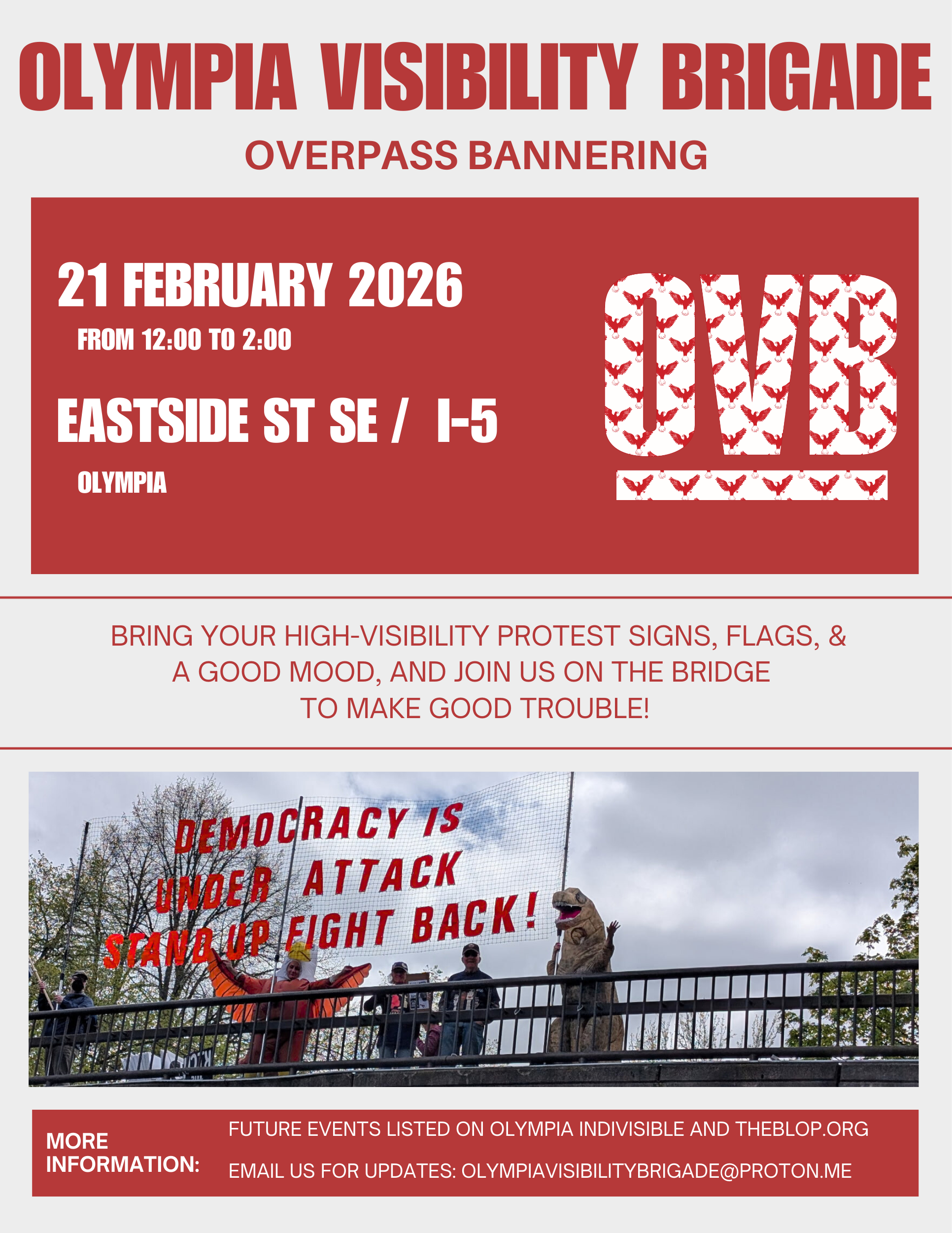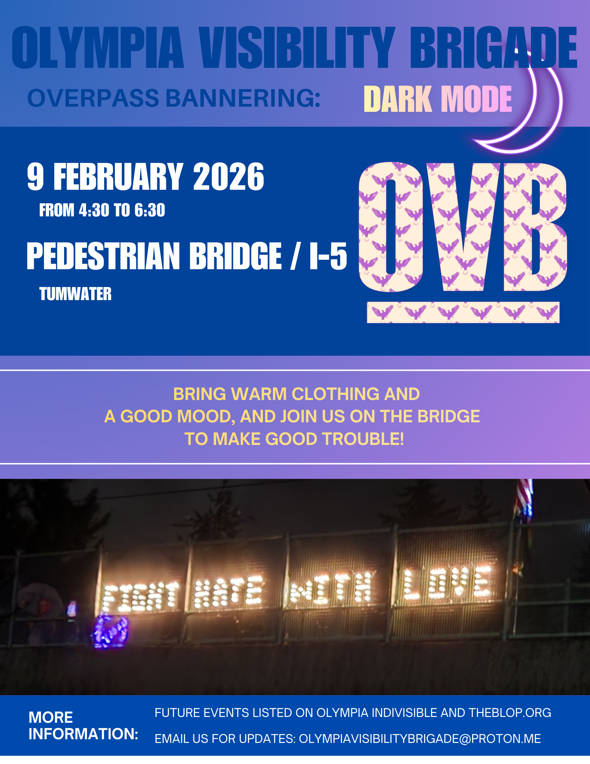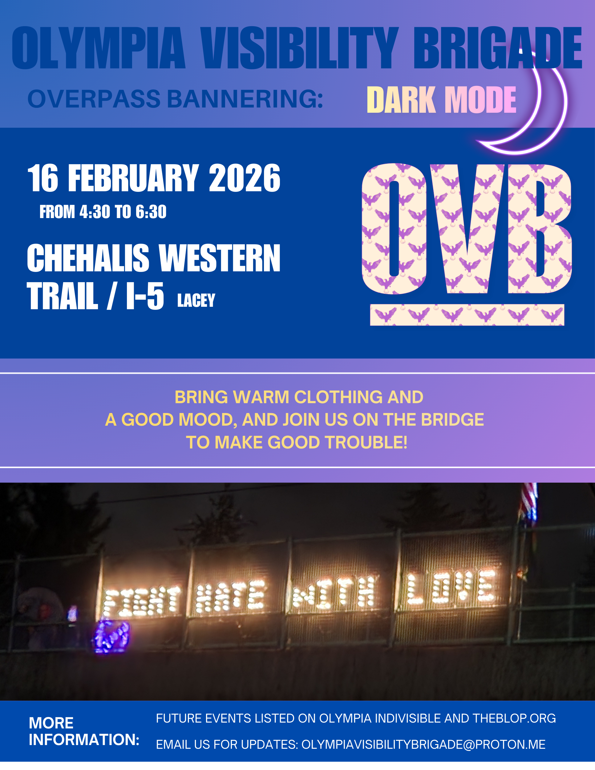 Join us on February 16, 2026, for an overpass bannering event at the Chehalis Western Trail/I-5 in Lacey from 4:30 to 6:30 PM. Bring warm clothing and a good mood to make good trouble and fight hate with love. More information and updates available via the provided contact details.